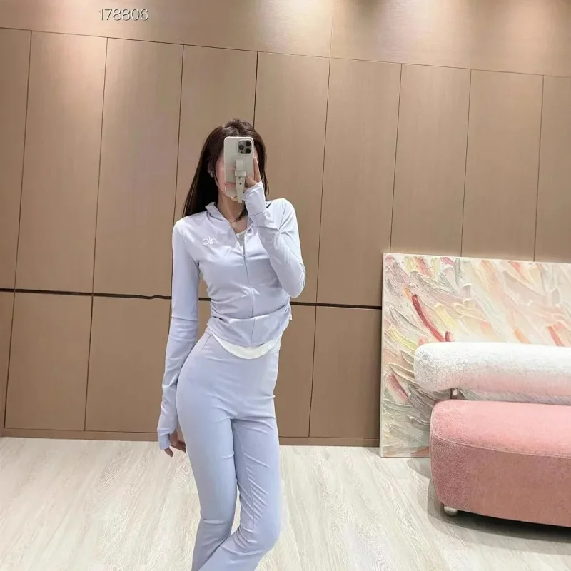 ALO 2025 Stand-up Collar Fake Two-Piece Elastic Waist Flared Pants Casual Sports Suit (3 styles)-2579