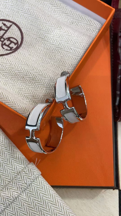Hermès metal H letter white leather earrings-3714