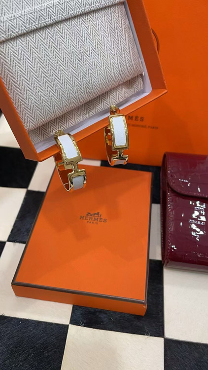 Hermès metal H letter white leather earrings-3714