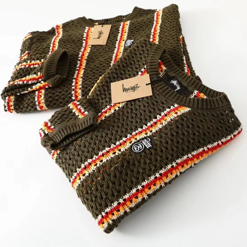 Home > Stussy striped openwork knit crew neck sweater-5510